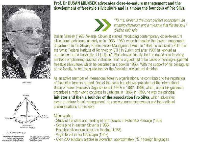 was one of the initial founders of Pro Silva (1989), emeritus Professor for silviculture, at the biotechnical unisersity of Ljubljana. Also after his active days he gave inspiration and motivation for a whole generation. He had the jubiliee of his 90th birthday in 2015.