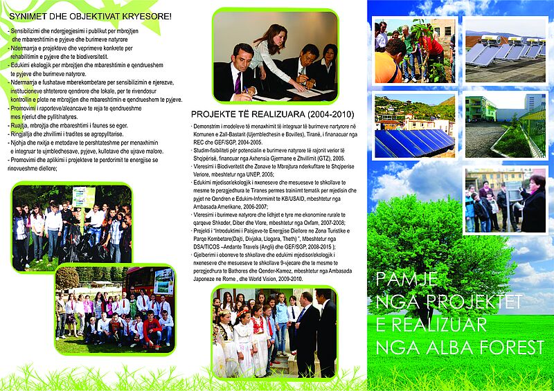 AlbaForest has worked intensively in the field of natural resources management and rural economy livelihoods improvement issues in Albania . It has already acquired a rich experience in implementing projects related to the field of natural resources management, forestry, watersheds management, eco-tourism, urban environmental improvement and green areas rehabilitation, climate change, renewable energy and environmental education.